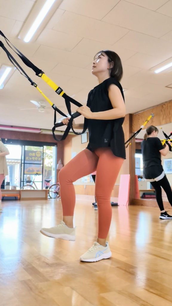 TRXというストラップを補助に使って、自分の体重で下半身を鍛えます!