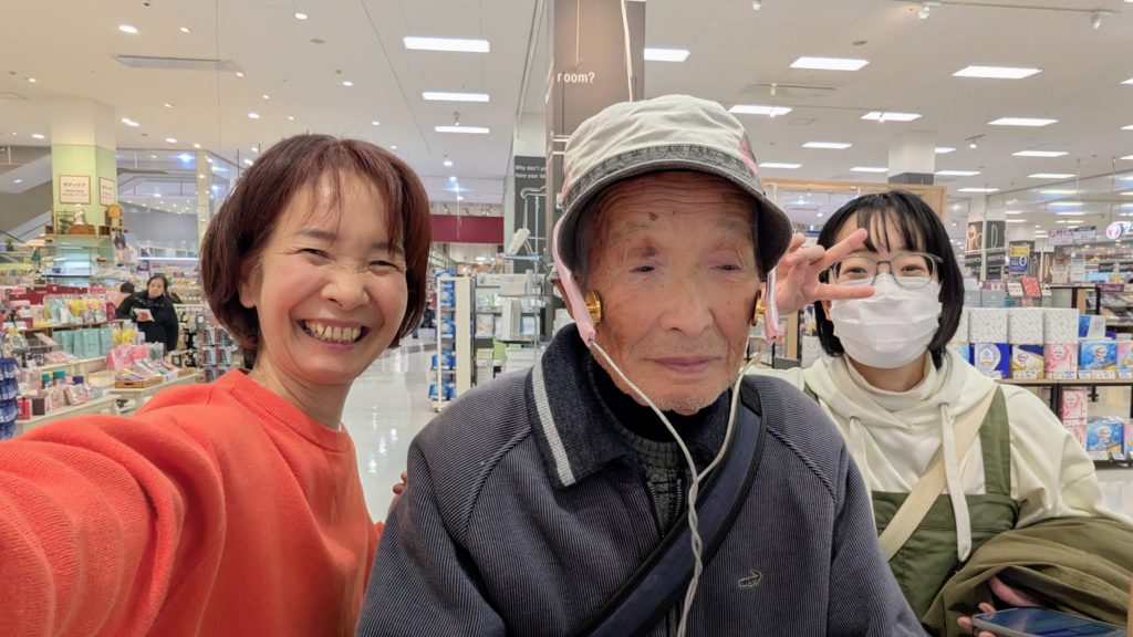 肌年齢を計るじいちゃん(笑)(左隣が私、右隣は私の娘)