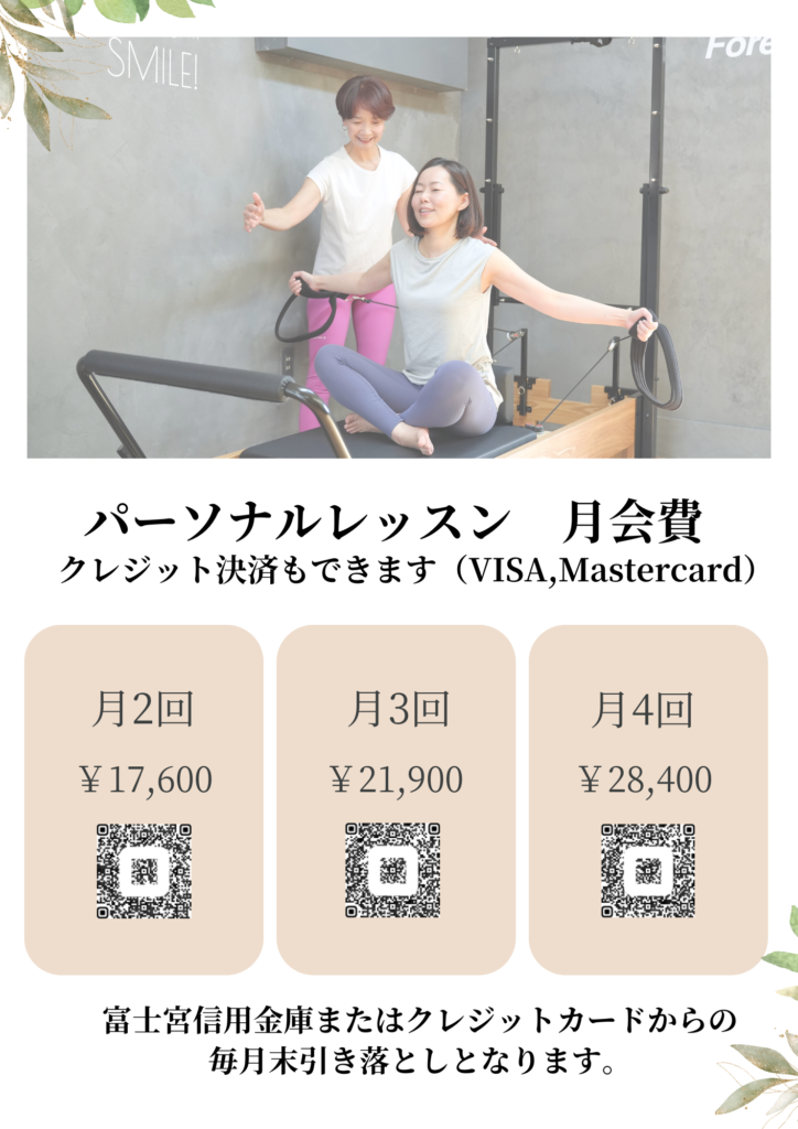 グループレッスンでは時間が合わない方、じっくり自分だけを見てもらいたい方、病気やケガ後のリハビリをしたい方など、ぜひパーソナルレッスンにてご相談下さいね。